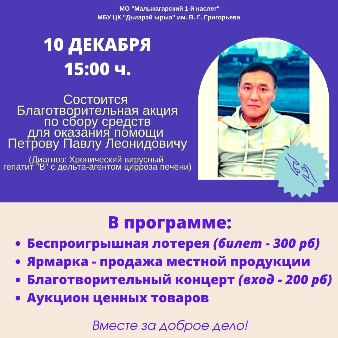 10 декабря, 15:00 ч. в Центре культуры «Дьиэрэй ырыа» состоится благотворительная акция по сбору средств для оказания помощи Петрову Павлу Леонидовичу. Диагноз: Хронический вирусный гепатит «В» с дельта-агентом цирроза печени)